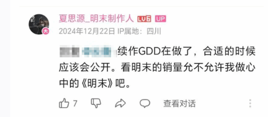 此外夏思源还透露,续作GDD已经在做了,在合适的时候应该会公开。不过这还是要看《明末》的销量情况:“看明末的销量允不允许我做心中的《明末》吧。”
