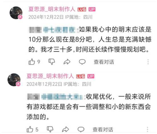 值得一提的是,《明末》制作人夏思源在回复B站网友评论时曾透露,本作在当时已经进入收尾阶段了,“如果满分10分,那么现在应该是8分吧,人生总是充满缺憾的。”