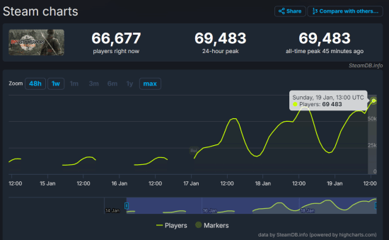 而就在今天,《真三国无双:起源》迎来了发售后的首个周末。根据SteamDB的数据显示,本作的Steam在线峰值来到了69,483人,即将突破7万大关。