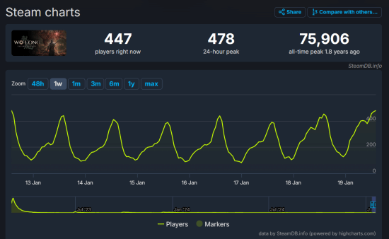 据悉,这个人数已经是《真三国无双》系列在Steam平台史上最高的一次,也是光荣旗下在线峰值第二高的游戏,仅次于《卧龙:苍天陨落》(75,906人)。